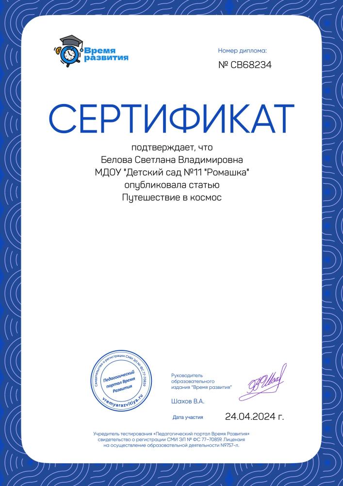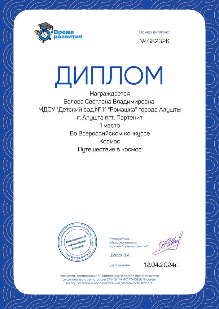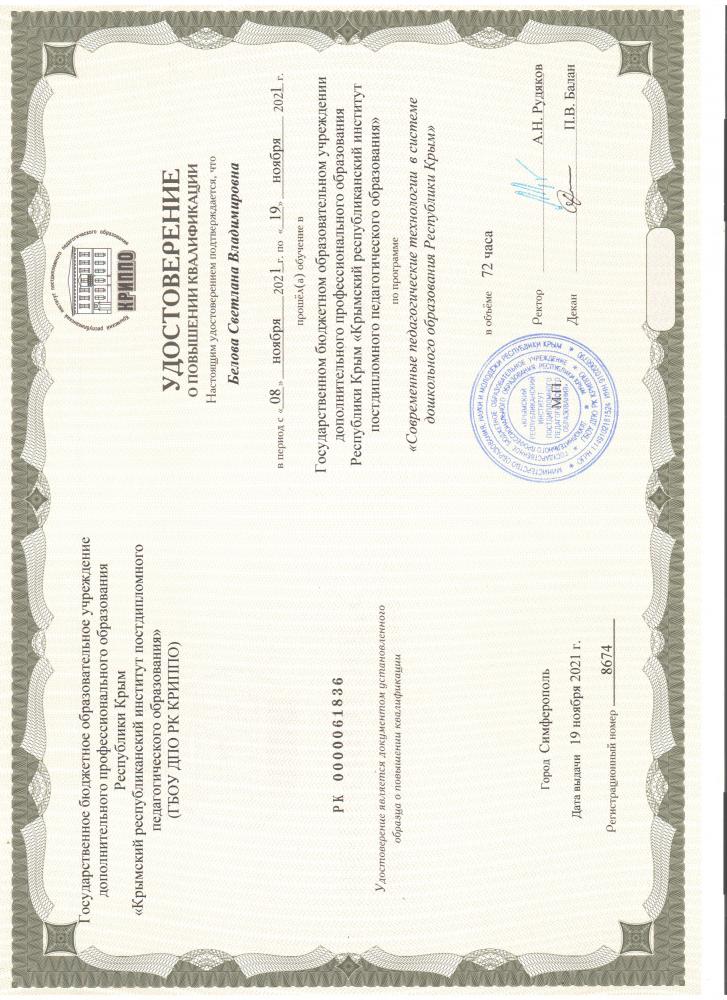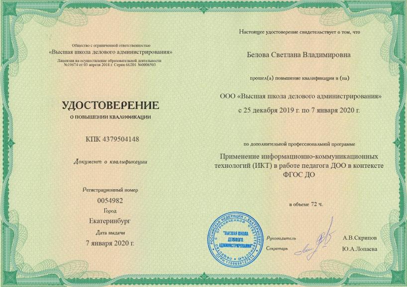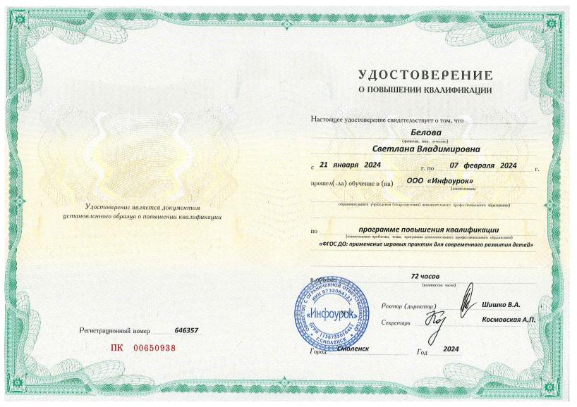 КПК | 21.01.2024г.-07.02.2024г. (72часа, ООО «Инфоурок») «ФГОС ДО: применение игровых практик для современного развития детей» |
