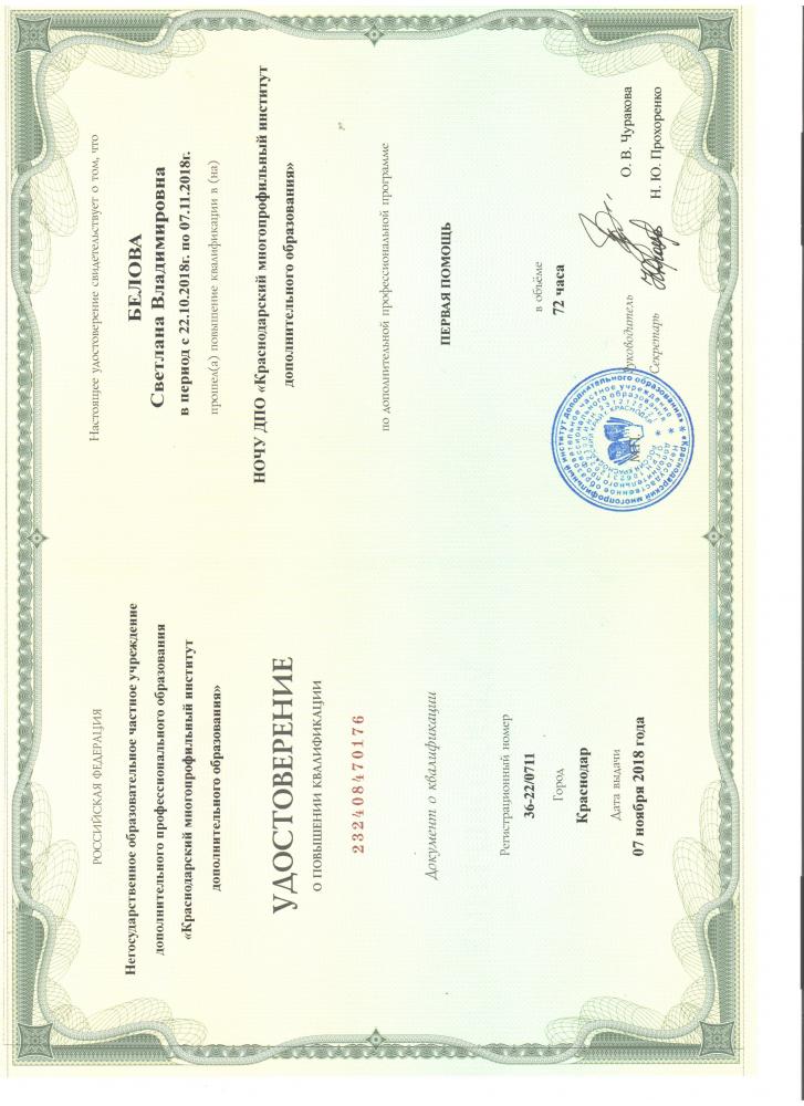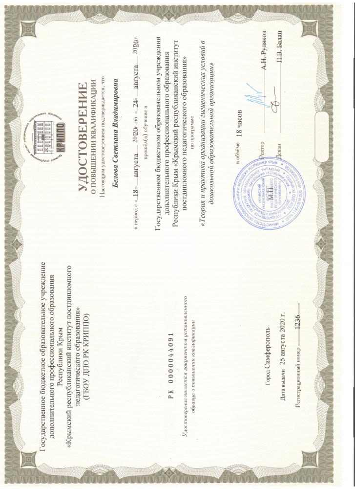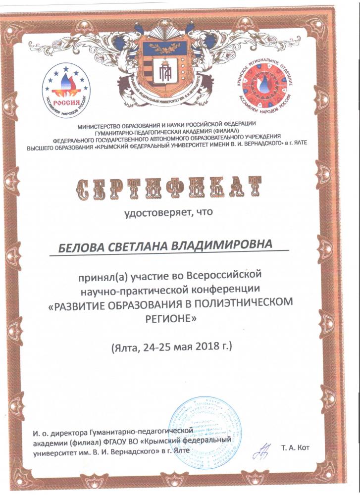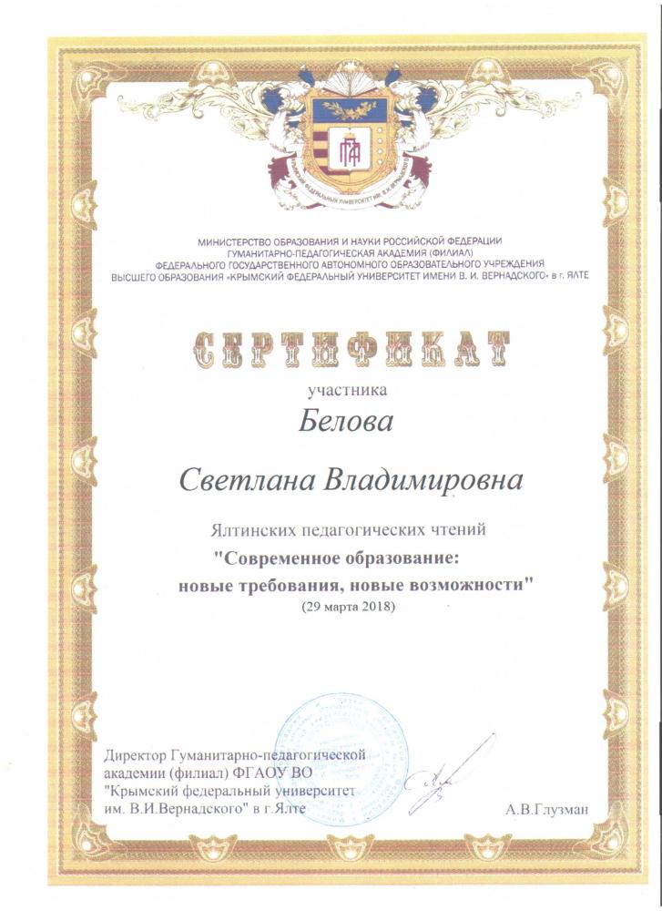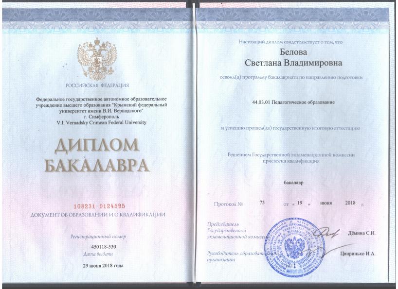Образование/ | Высшее, ФГАОУ ВО «Крымский федеральный институт им. В.И.Вернадского», 2018г. |