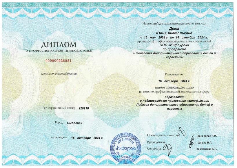 Профессиональная переподготовка | 16.05.2024г.-16.10.2024г. (ООО «Инфоурок», 300 час.) по программе «Педагогика дополнительного образования детей и взрослых» |