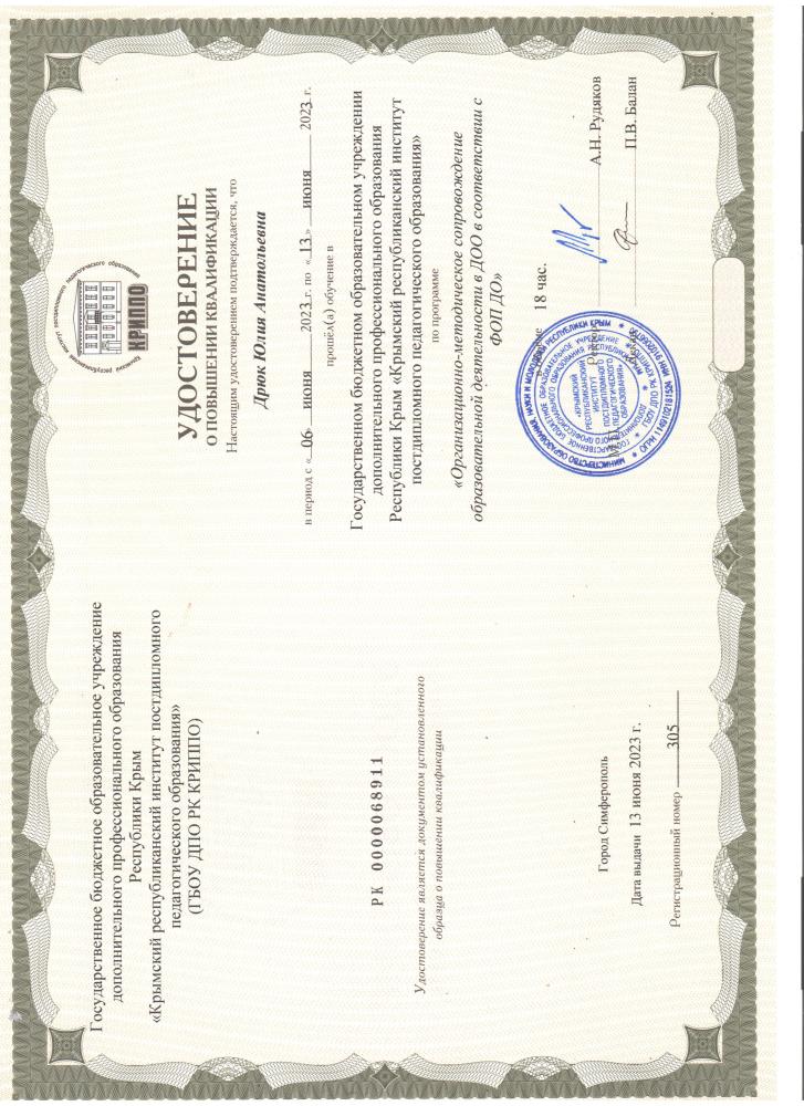 КПК по ФОП | 06.06.2023-13.06.2023 (18 ч., ГБОУ ДПО КРИППО г.Симферополь) «Организационно-методическое сопровождение образовательной деятельности в ДОО в соответствии с Федеральной образовательной программой дошкольного образования (ФОП ДО)» |