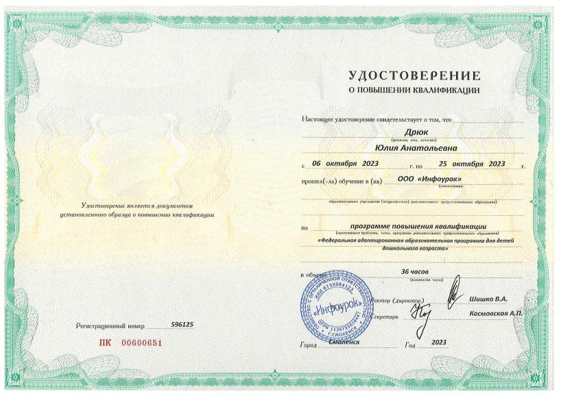 КПК по ФАОП | 06.10.2023-25.10.2023 (36ч., ООО «Инфоурок») «Федеральная адаптированная образовательная программа для детей дошкольного возраста» |