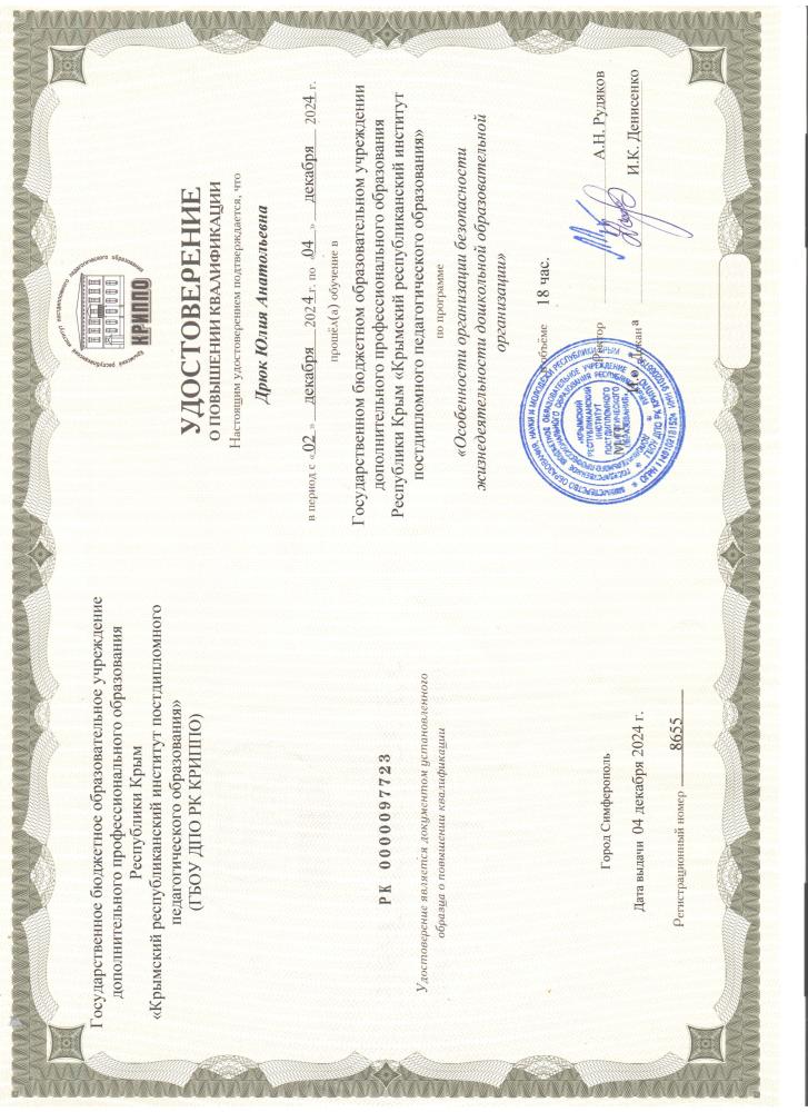 КПК | 02.12.2024-04.12.2024 (18 ч., ГБОУ ДПО КРИППО г.Симферополь) «Особенности организации безопасности жизнедеятеьности дошкольной образовательной организации» |