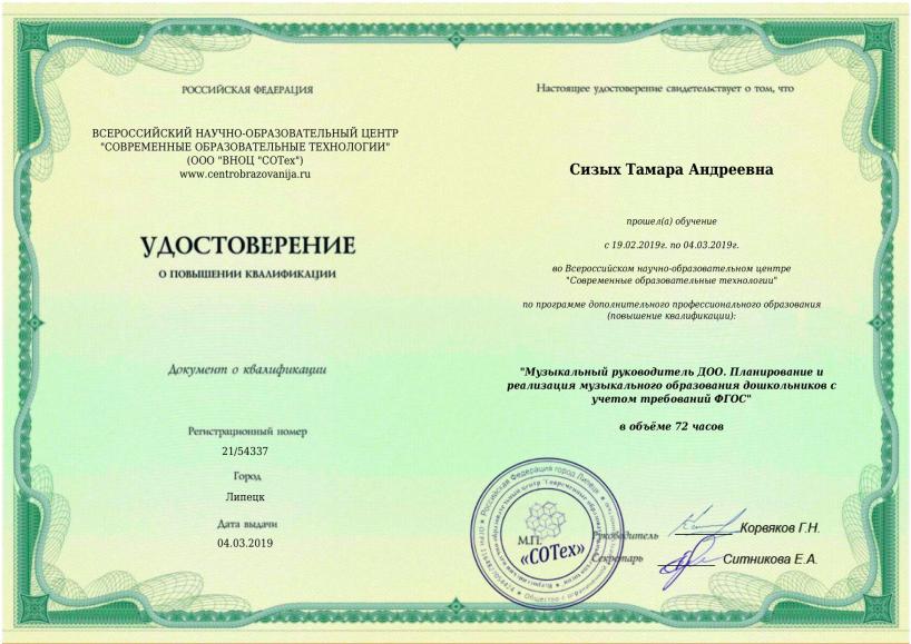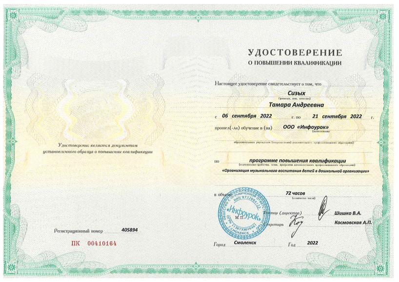 КПК | 06.09.2022г.-21.06.2022г. (72 часа, ООО «Инфоурок») «Организация музыкального воспитания в дошкольной организации» |