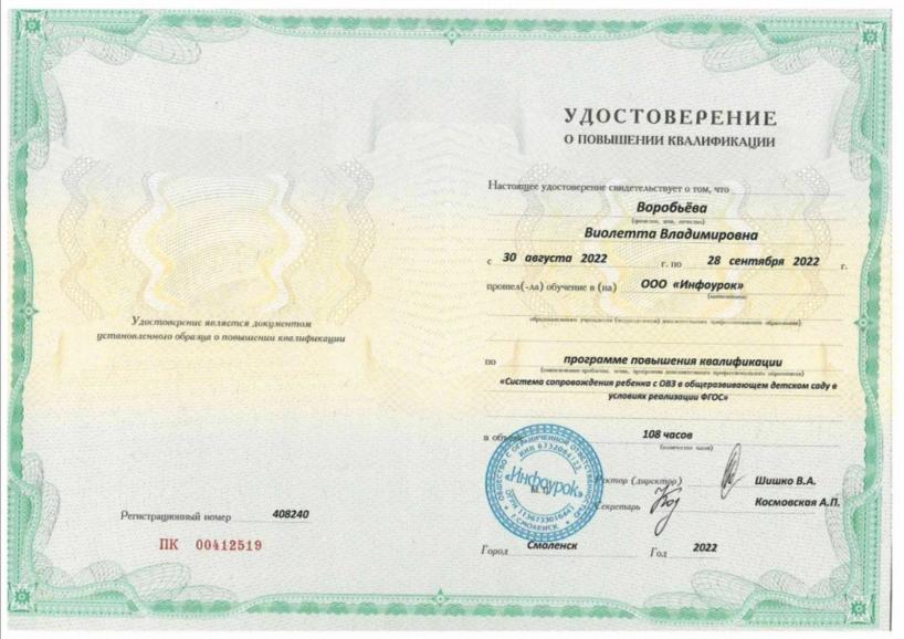КПК по ОВЗ | 30.08.2022г.-28.09.2022г. (108 час., ООО «Инфоурок») «Система сопровождения ребенка с ОВЗ в общеразвивающем детском саду в условиях реализации ФГОС» |
