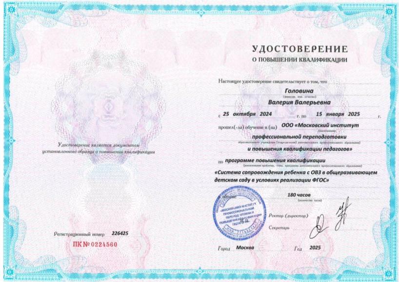 КПК | 25.10.2024г.-15.01.2025г. (180 час, ООО «Московский институт профессиональной переподготовки и повышения квалификации педагогов») по программе «Система сопровождения ребенка с ОВЗ в общеразвивающем детском саду в условиях реализации ФГОС» |