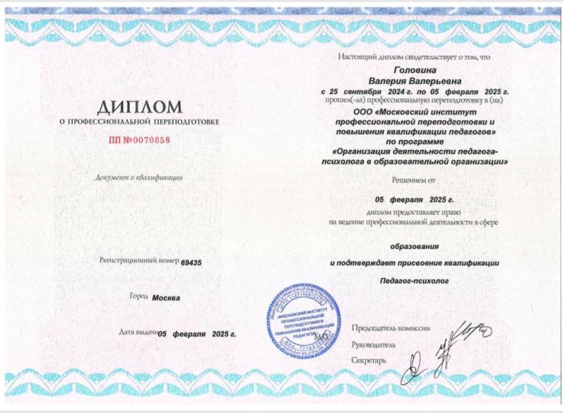 Профессиональная переподготовка 1 | 05.02.2025г. (540 час, ООО «Московский институт профессиональной переподготовки и повышения квалификации педагогов») по программе «Организация деятельности педагога-психолога в образовательной организации» |