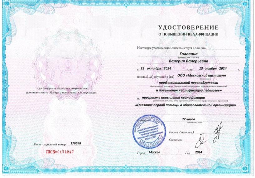 КПК | 25.10.2024г.-13.11.2024г. (72 час, ООО «Московский институт профессиональной переподготовки и повышения квалификации педагогов») по программе «Оказание первой помощи в образовательной организации» |